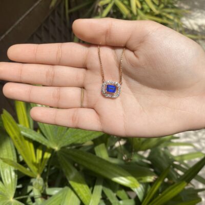 A diamond pendant featuring a colored stone combines timeless elegance with a vibrant, modern twist. The brilliant diamond centerpiece is accentuated by a carefully chosen synthetic colored gemstone, creating a stunning contrast that captures attention. This piece not only radiates luxury and sophistication but also offers a unique and personalized touch, making it a cherished addition to any jewellery collection.