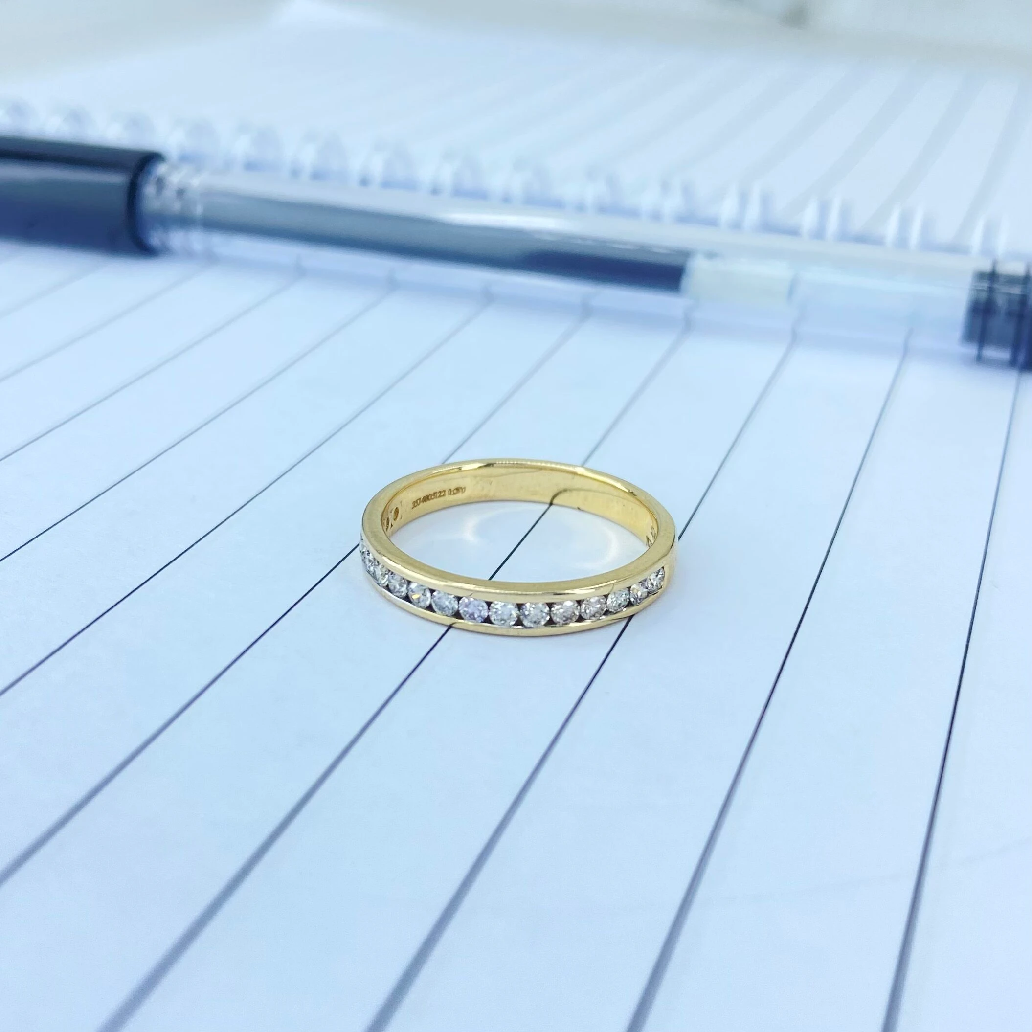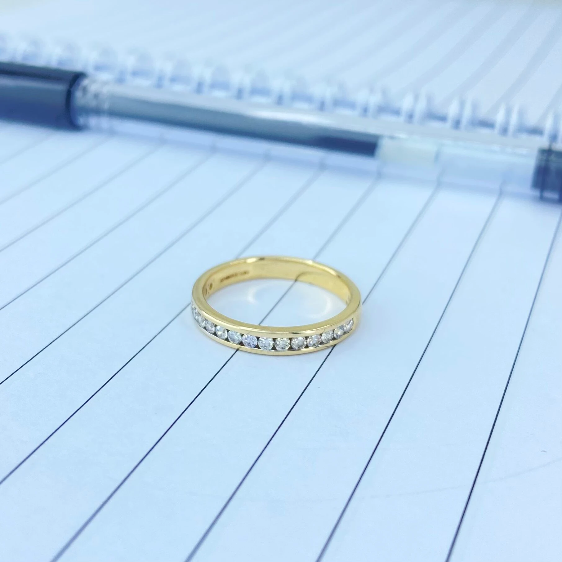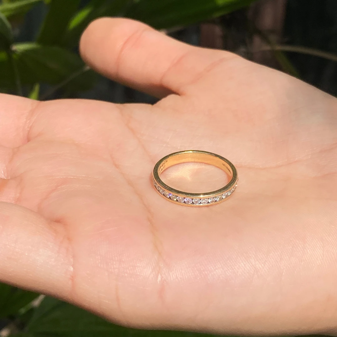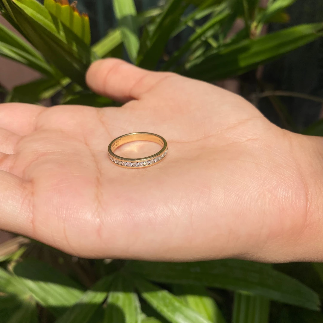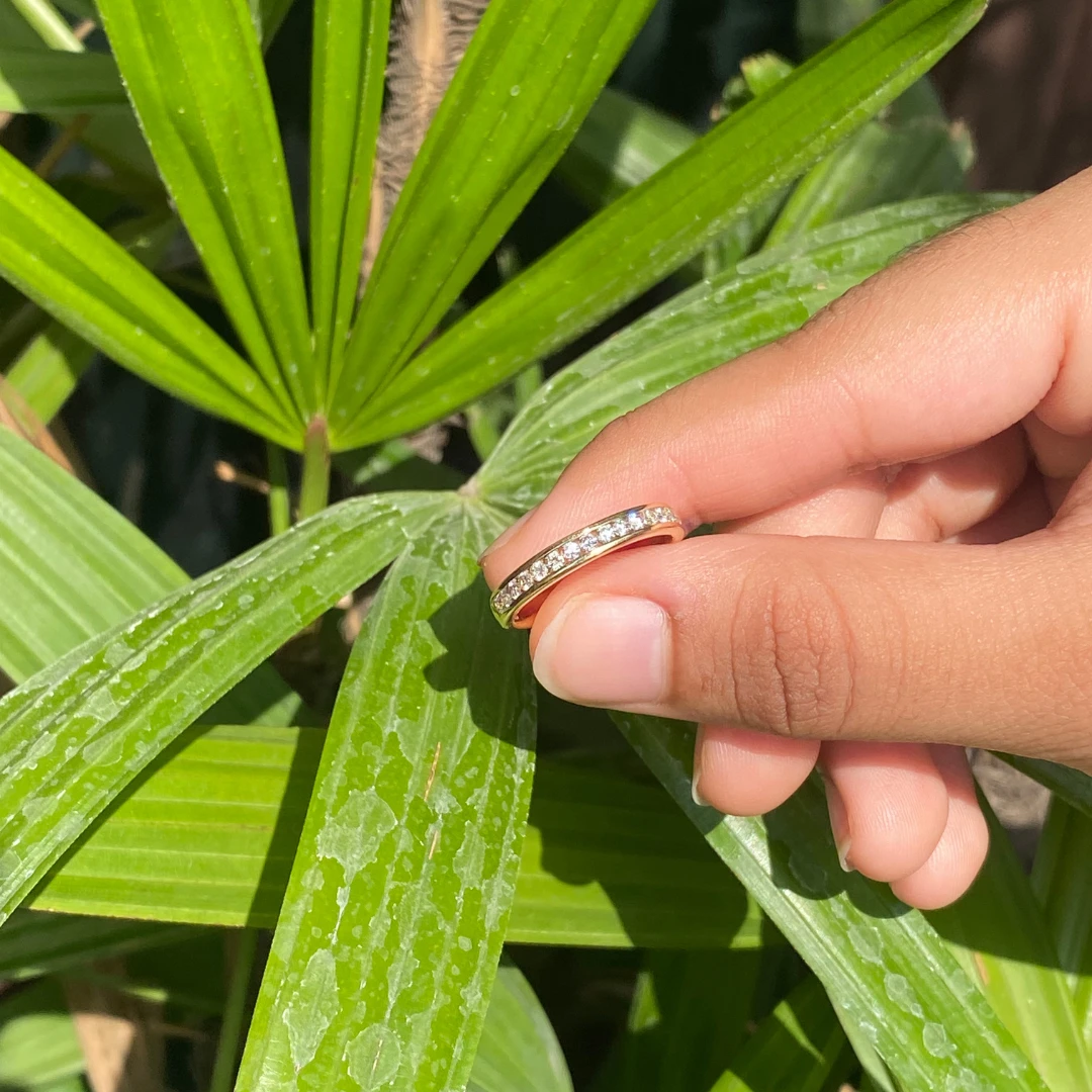 Classic pave diamond ring in 14/18karat gold with 17 diamond stacked one after another.